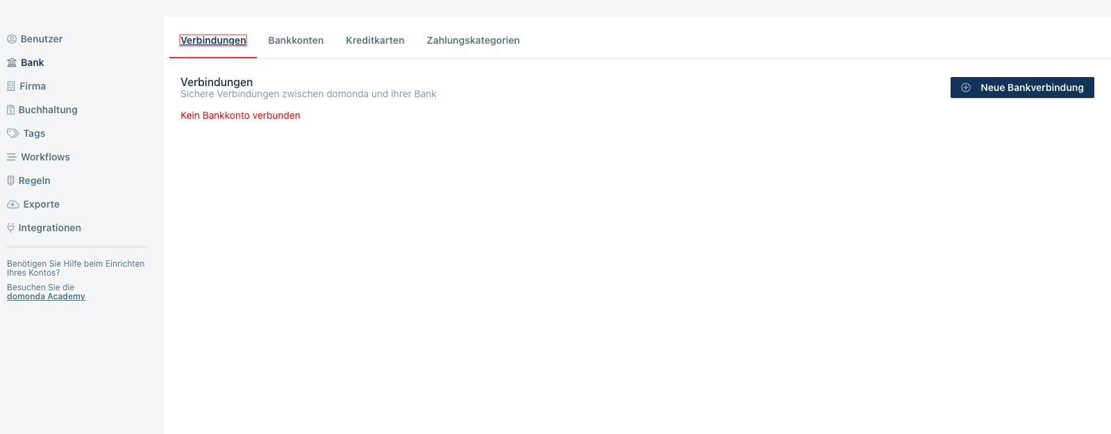 In den domonda Einstellungen ist der Unterpunkt “Bank” mitangeführt. Hier können Sie Ihre Bank-Verbindungen wie Ihre Bank und Kreditkonten verwalten sowie Zahlungskategorien editieren bzw. verwalten.