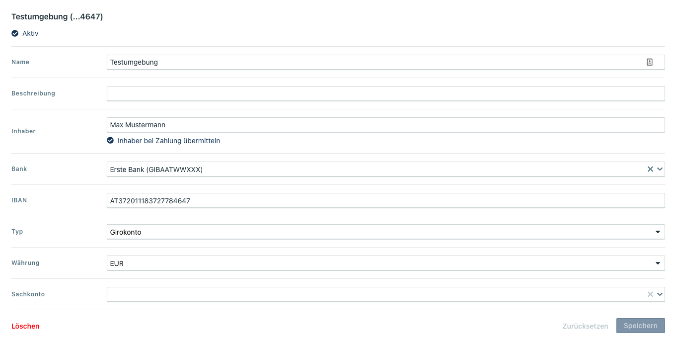 Das Feld für den IBAN kann von Ihnen bei manueller Anlage des Kontos mit dem IBAN des Kontos befüllt werden.