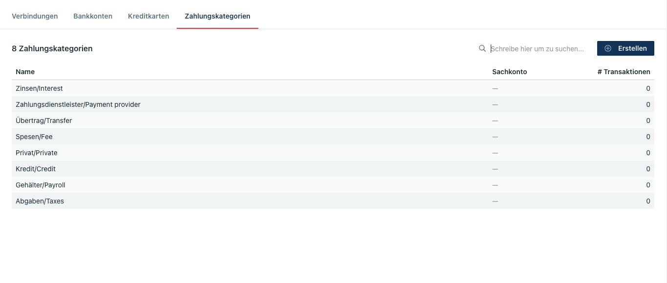 Bei den Zahlungskategorien sind Zahlungskategorien hinterlegt, welche mit einer Transaktion verknüpft werden können, für die es keinen Beleg gibt (z.B. Spesen oder Zinsen etc.). Hier ist es wichtig, die jeweiligen Sachkonten der einzelnen Kategorien nach Rücksprache mit Ihrem Steuerbüro zu hinterlegen.