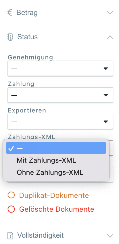 Dokumente, welche bereits als Zahlungs-XML exportiert wurden, können in domonda gefiltert werden. Den entsprechenden Filter finden Sie in Dokumente → Status → Zahlungs XML → Mit Zahlungs-XML / Ohne Zahlungs XML.