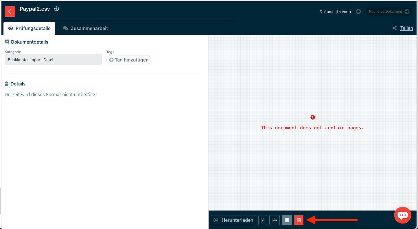 Sobald die CSV-Datei gelöscht wurde, können Sie diese Datei jederzeit wiederherstellen. Wenn Sie die Datei noch einmal hochladen, erscheint ein Button, der Sie nach einem Klick zur Ansicht des gelöschten Dokuments führt.