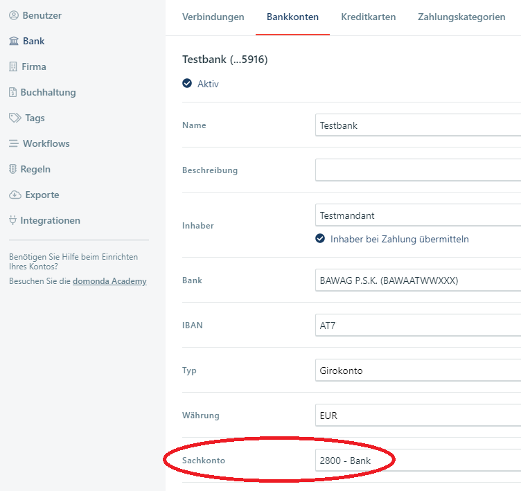 Für die Übertragung der Transaktionen von domonda zu DATEV ist es notwendig, in den Einstellungen der Bankkonten das entsprechende Sachkonto aus DATEV zu hinterlegen.