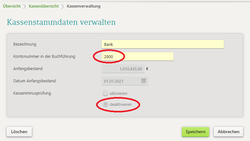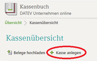 Zusätzlich muss in DATEV Unternehmen Online ein Kassabuch mit dieser Kontonummer angelegt werden. Dabei achten Sie bitte darauf, die Funktion “Kassenminusprüfung” zu deaktivieren.