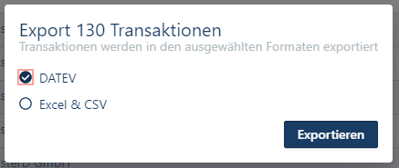 Anschließend können Sie über den Button “Alle exportieren” das Exportformat auswählen. Hier steht Ihnen das Format Excel/CSV sowie DATEV zur Verfügung.