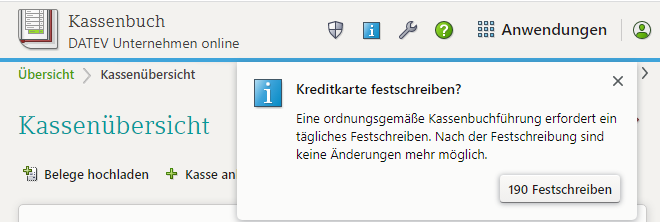 Die Transaktionen sind nach Übertragung in DATEV Unternehmen Online in der Kassenübersicht vorhanden. Sie werden dann automatisch aufgefordert, die Daten “Festzuschreiben”. Damit werden die Daten automatisch auch für DATEV Rechnungswesen bereitgestellt.