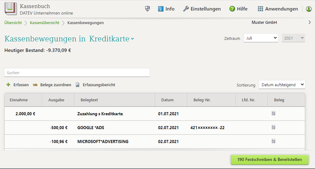 Nun können Sie die Transaktionen (samt Buchungsinformationen) über “Belege buchen” einspielen, bearbeiten und speichern.