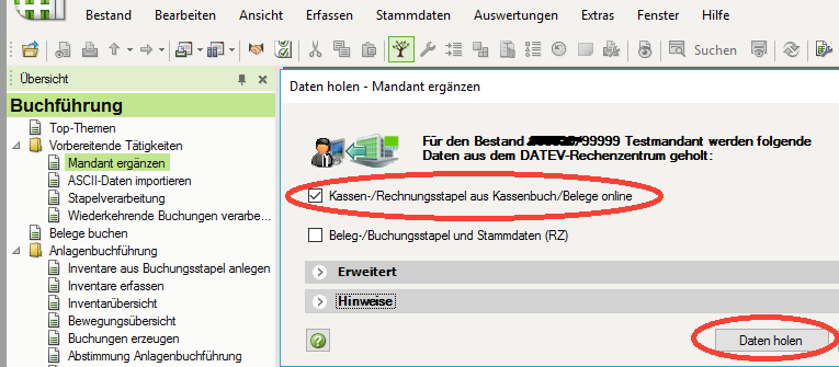 Jetzt geht es in Kanzlei-Rechnungswesen weiter. Um die Belege aus DATEV Unternehmen Online zu holen, nutzen Sie den Menüpunkt “Mandant ergänzen”, wählen “Kassen-/Rechnungsstapel” und klicken anschließend auf “Daten holen”.
