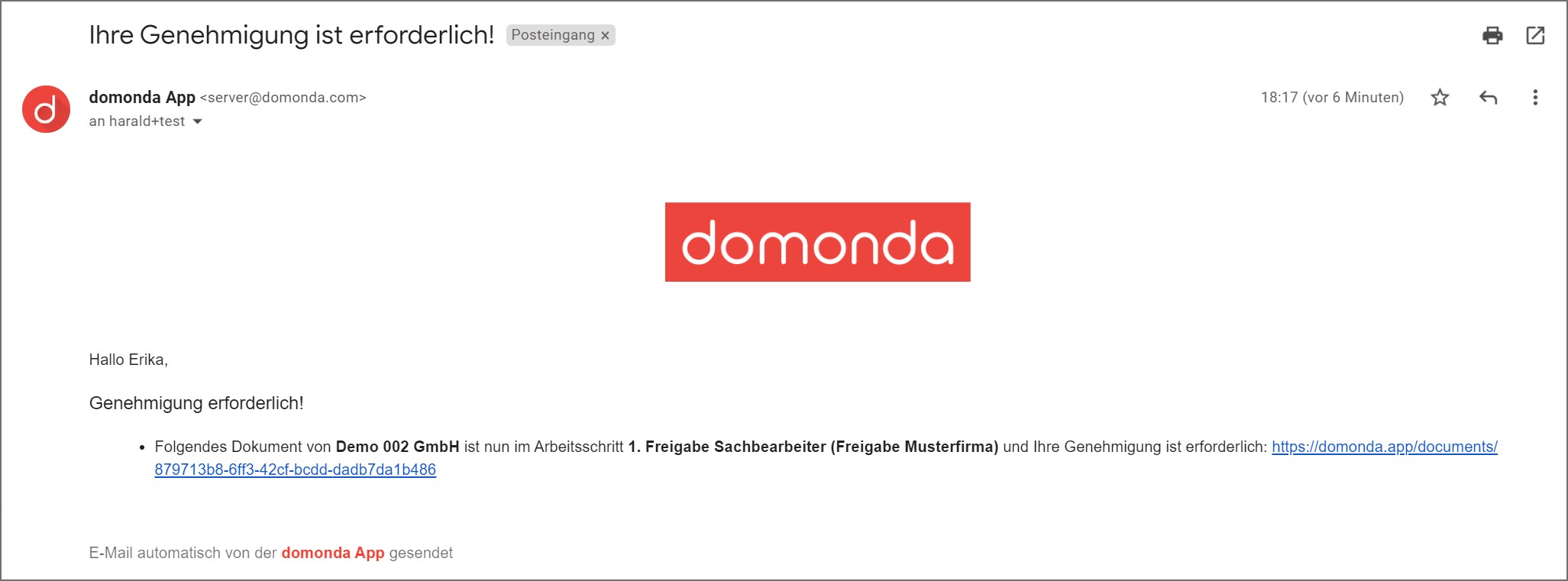 Der Freigabeprozess in domonda weist einen hohen Grad an Automatisierung auf. Unterschiedliche Freigabeprozesse lassen sich beispielsweise auf Basis von Rechnungsbeträgen, Lieferantennamen oder Rechnungskategorien automatisch ansteuern. Die verantwortlichen Personen erhalten automatisiert E-Mails mit einer Aufforderung zur Freigabe der Rechnungen.