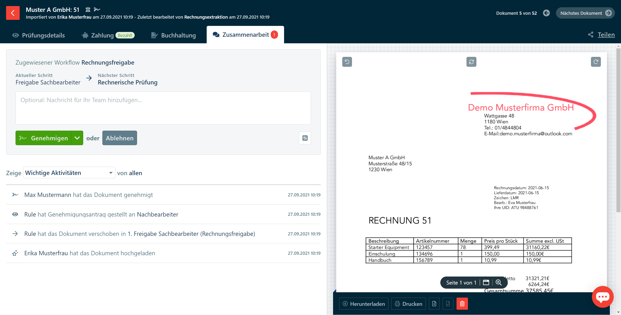 Dort angekommen, kontrolliert der Bearbeiter die Rechnung inhaltlich, sieht den aktuellen Arbeitsschritt und kann mit einem Klick auf Genehmigen die Rechnung freigeben und diese in den nächsten Arbeitsschritt bewegen: