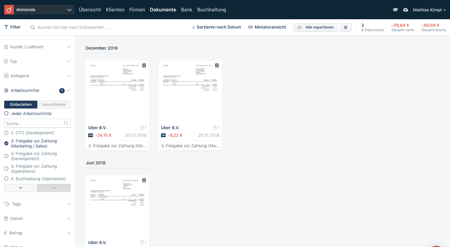 Filteroptionen in der Dokumentenübersicht helfen bei der Kontrolle und Auffindung von Belegen in den unterschiedlichen Arbeitsschritten.