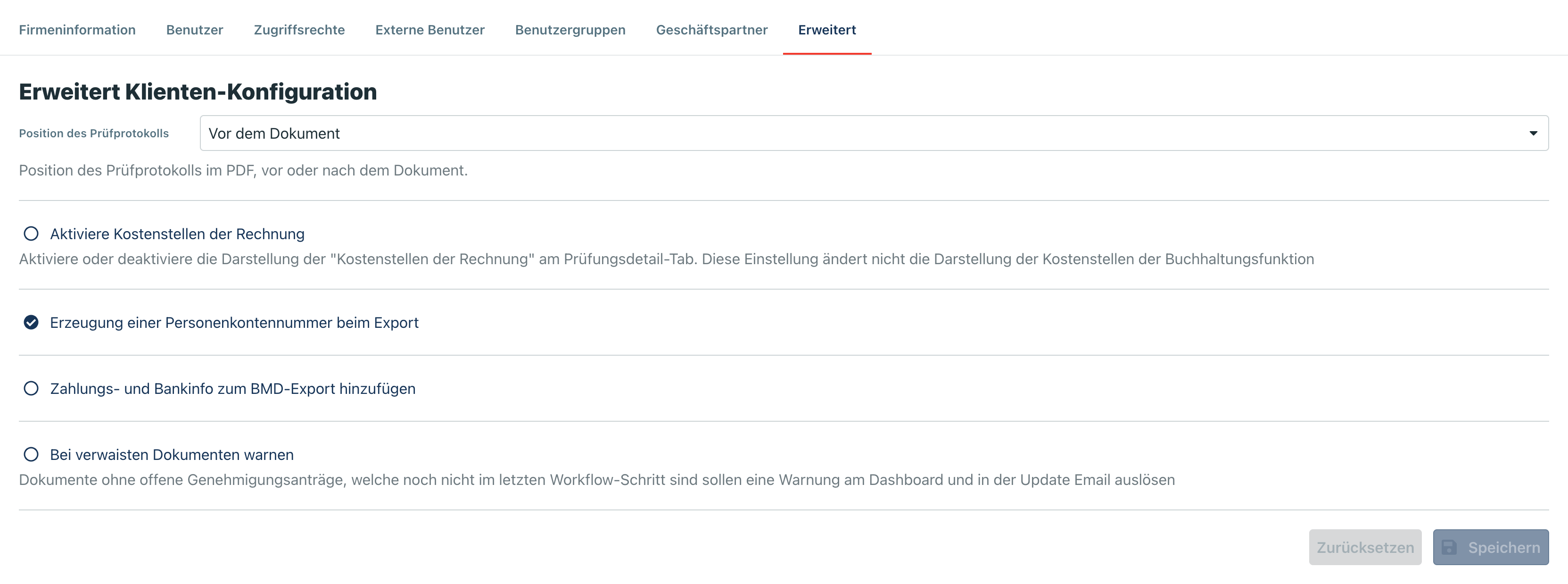 Diese Funktion ist Standardmäßig aktiv und kann in den erweiterten Einstellungen deaktiviert werden (Siehe “Erzeugung einer Personenkontennummer beim Export“).