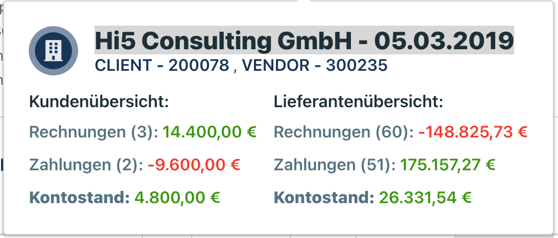 Rechnungen: alle Rechnungen die dem jeweiligen Geschäftspartner (Kunde und/oder Lieferant) zugeordnet sind. Rechnungen markiert mit Status “Nicht zahlbar” werden ignoriert. Archivierte Rechnungen werden ebenfalls ignoriert.