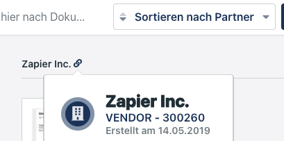 In der Dokumenten-Suchzeile können Sie nach einem konkreten Geschäftspartner in Ihrem Bestand suchen. Einerseits bietet Ihnen die Suchfunktion die Volltextsuche nach dem eingegebenen Begriff an, weiters zeigt es aber bereits alle Geschäftspartner mit diesem Namen zur gefilterten Auswahl an.